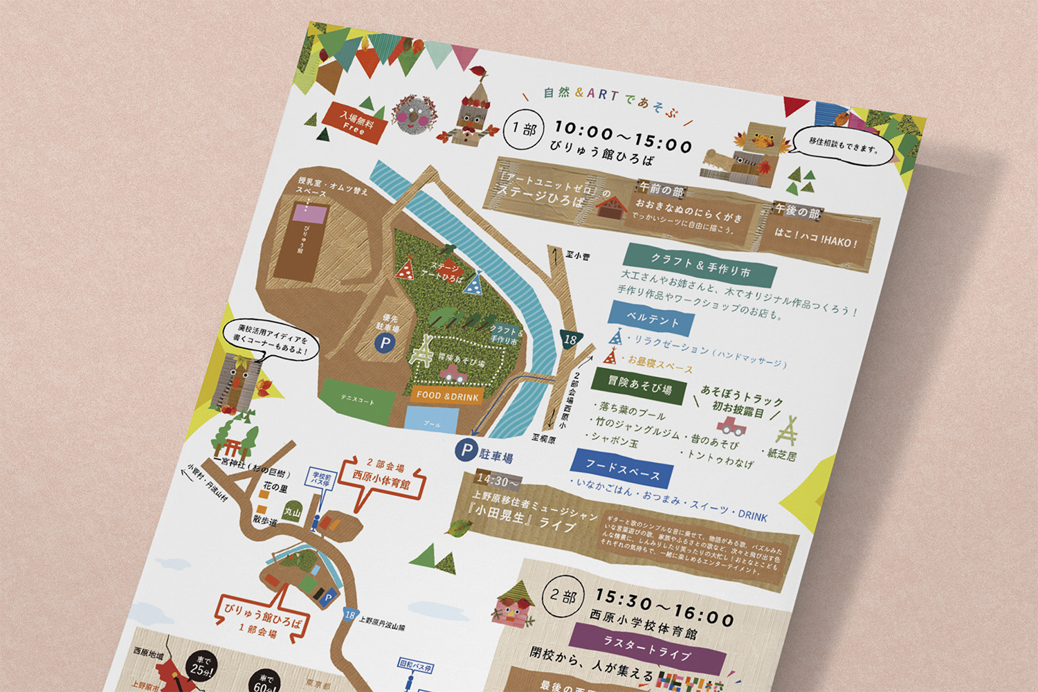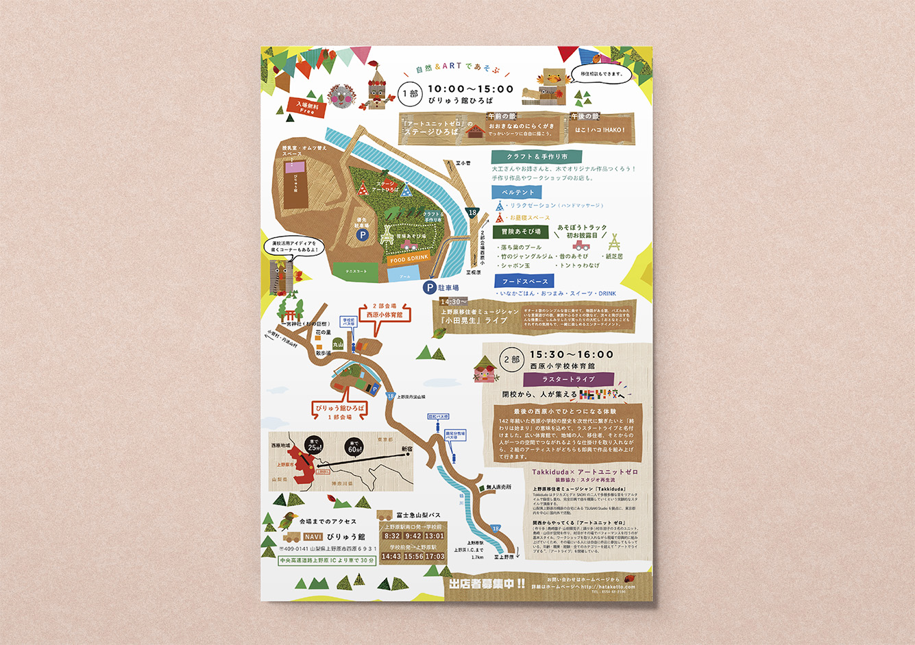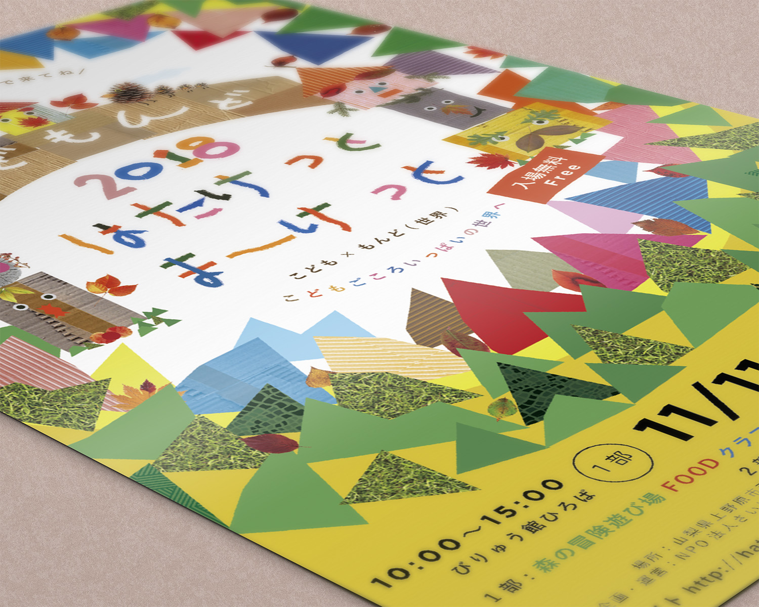 ダンボールや落ち葉など、子どもたちが日常で触れる自然素材を集め、コラージュで構成しました。手で集め、切り、組み合わせるプロセスを通して、偶然性や遊び心が生まれる表現を大切にしています。『ペライチのデザイン チラシのスタイル別レイアウト集』(ビー・エヌ・エヌ新社/BNN編集部・開発社)に掲載されました。
